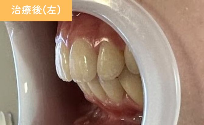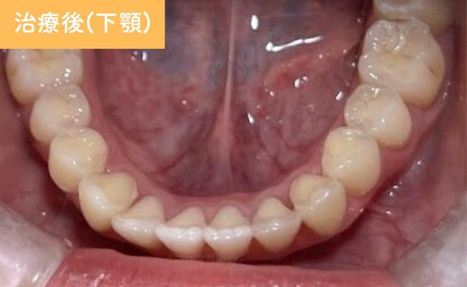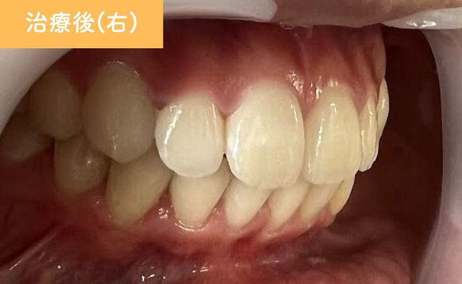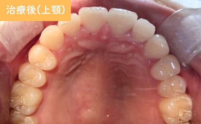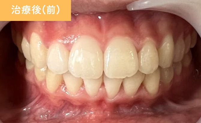 歯列全体のアーチも整い、前歯の噛み合わせが適切な位置に改善。見た目だけでなく、機能的にも安定した咬合が得られています。