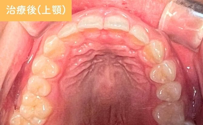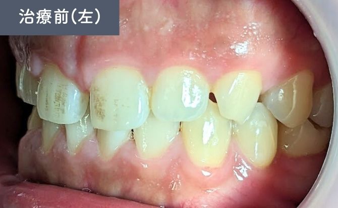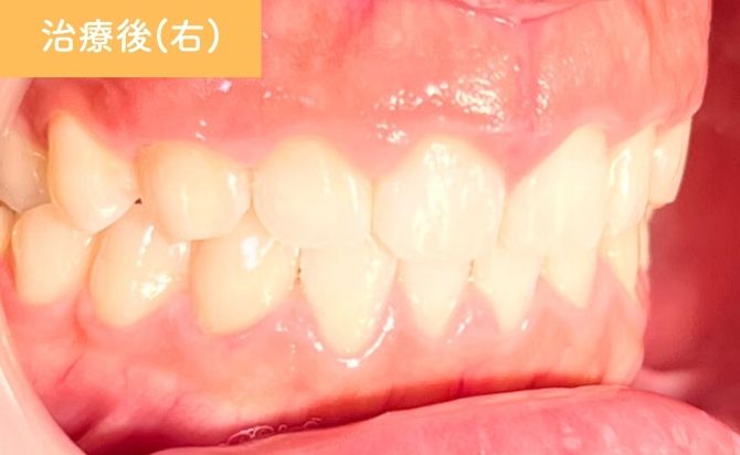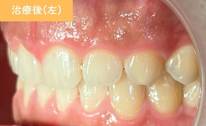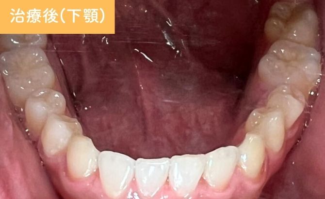 前歯をわずかに後方へ整えたことで、口元全体がすっきりとした印象となり、審美面・機能面ともに良好な結果が得られました。