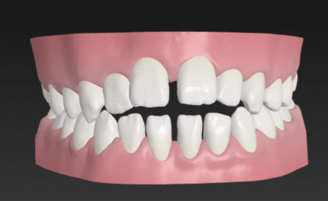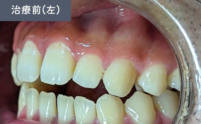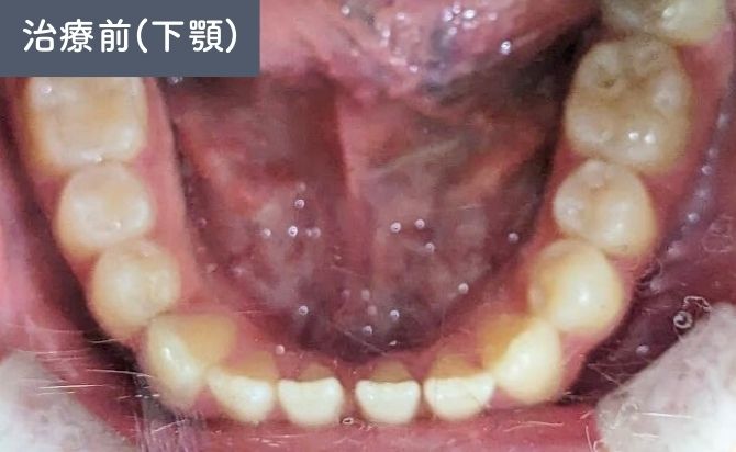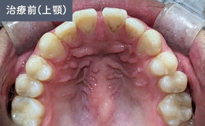 上下前歯には軽度の前突傾向があり、歯列弓の乱れによって歯間空隙と噛み合わせの不安定さが生じている状態でした。