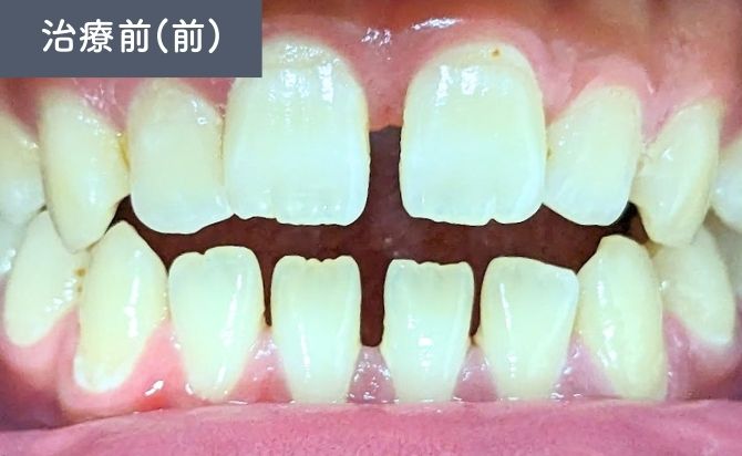 診察では、上顎左右1番間の歯間空隙(すきっ歯)が認められ、審美面での改善希望が強い症例でした。また、前歯部では上下の噛み合わせが接触しない開咬(オープンバイト)の状態が確認されました。