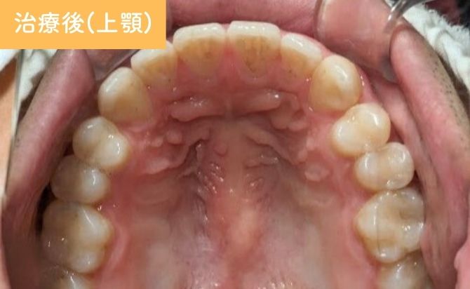 治療終了時には、上顎前歯の歯間空隙が閉鎖され、前歯部の開咬も改善しました。上下前歯の前突感が軽減され、歯列弓も自然な形態に整っています。