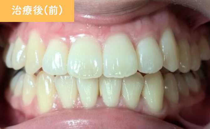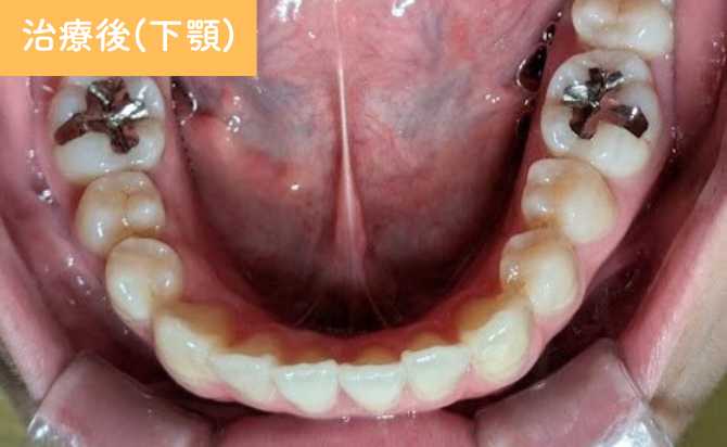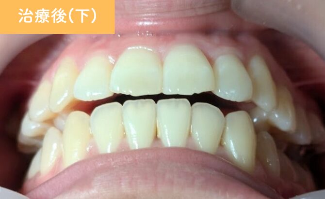 治療終了時には、歯列弓が自然な形態へと整い、前歯の突出感が軽減しました。下顎前歯の叢生も改善し、歯列全体がバランスよく整っています。