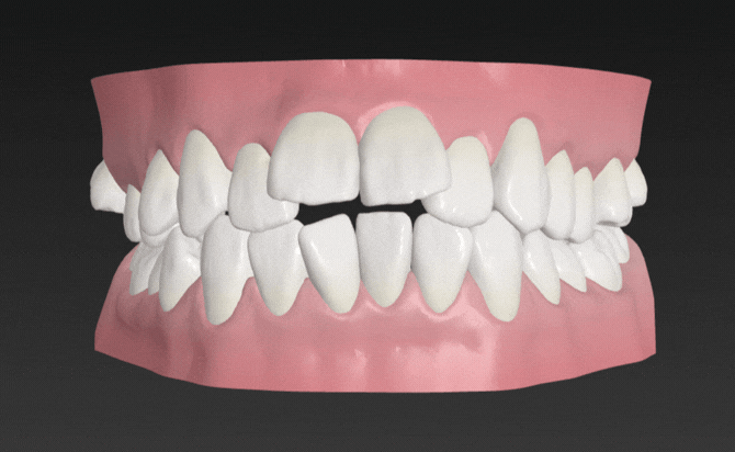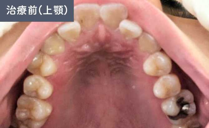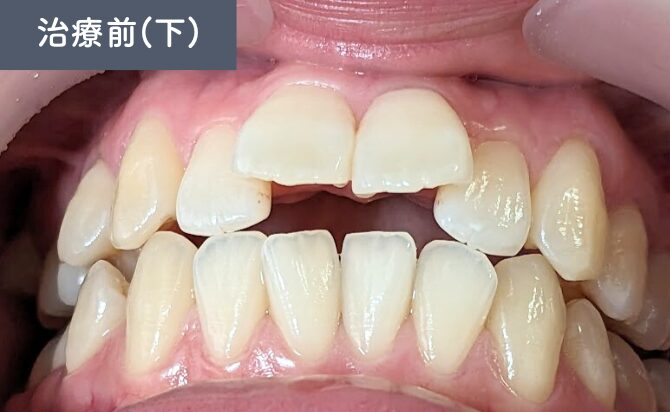 咬合状態は奥歯を噛み合わせても前歯が接触しない開咬(オープンバイト)の状態であり、かつ上下の2番同士が接触する切端咬合も認められました。