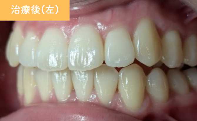 開咬は改善され、前歯が適切に接触する咬合関係が確立されました。切端咬合も改善され、機能的に安定した噛み合わせが得られています。