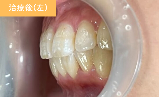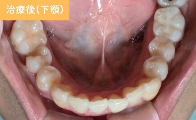 下顎左2番が歯列内へ適切に配列され、自然なアーチ形態が回復しました。現在は保定管理を行いながら、患者さまからの希望があり上顎の矯正治療を開始しています。